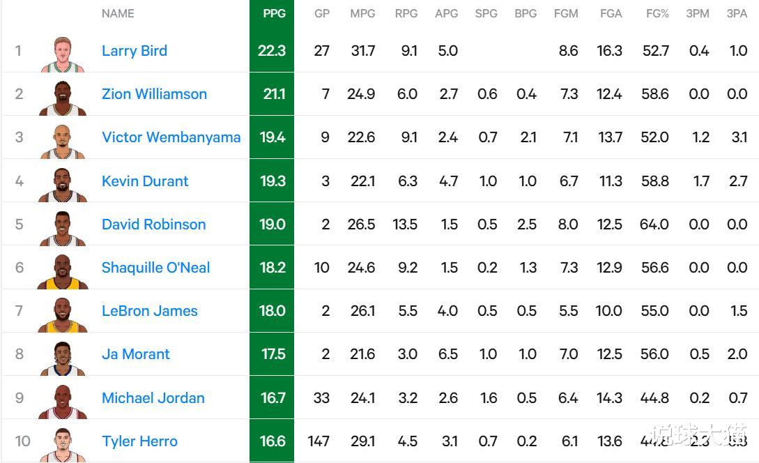 拉里-伯德是目前巨星打替补场均得分最高的存在,其在27场比赛中可以拿到22.3分,力压现役鹈鹕球员锡安,后者为21.1分。