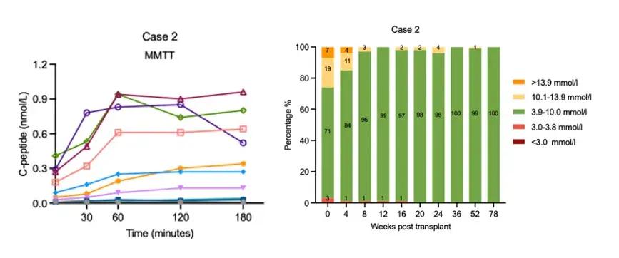 2023年12月30日,接受异体E-islet移植和标准剂量免疫抑制治疗。治疗后胰岛功能逐渐恢复正常,血糖控制显著改善(HbA1c从7.2%降至5.7%,TIR从71%升至100%),在第36周实现胰岛素彻底脱离,并维持血糖平稳(已维持该状态超过26个月)。该结果为“在标准剂量免疫抑制方案下,异体E-islet移植可实现外源胰岛素长期脱离”提供了强有力临床证据。