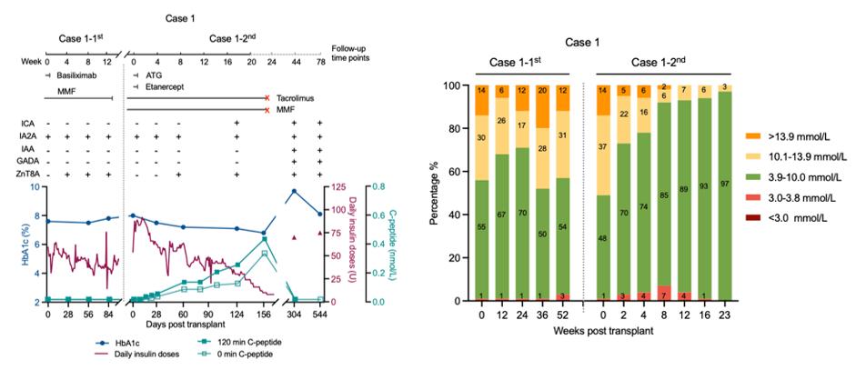 2023年5月12日,第二次移植采用自体E-islet移植和标准免疫抑制方案(基于“埃德蒙顿方案”),患者的胰岛C肽功能在术后第24周恢复至正常水平,血糖控制显著改善(HbA1c从8%下降至6.8%,TIR从48%增至97%,每日胰岛素注射剂量从54U减至8U)。但随访过程中患者因双相情感障碍疾病复发,自行停用了免疫抑制剂,最终导致移植胰岛因自身免疫攻击失效。