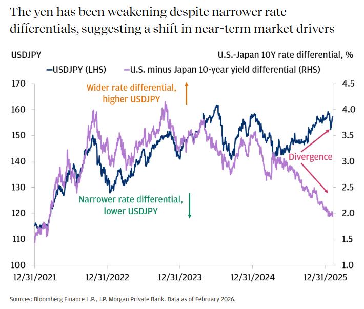 相比之下,自2025年中期以来观察到的贬值并非由仓位波动驱动,因为套利交易的积累规模相对有限。这种转变表明,美元/日元正在偏离其传统驱动因素,价格走势目前对财政风险的敏感性更高。