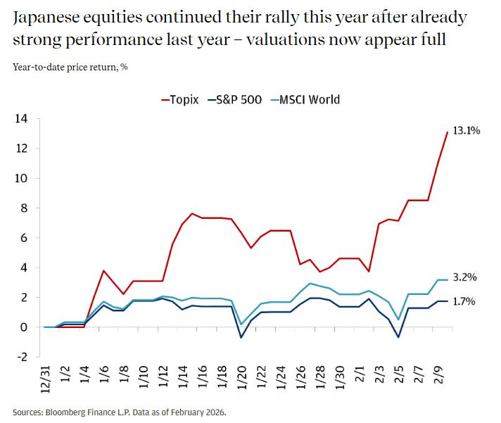 股市——此次选举结果对日本股市(今年以来表现显著优于全球市场)较为有利,因为财政支出增加和日元走软可能会提振企业盈利增长。然而,目前的估值已接近饱和,远期市盈率高达17.4倍,这是自全球金融危机以来的最低水平。因此,摩根大通对指数层面的股票维持策略中性,更倾向于选择那些能够受益于政策举措的特定行业进行投资。