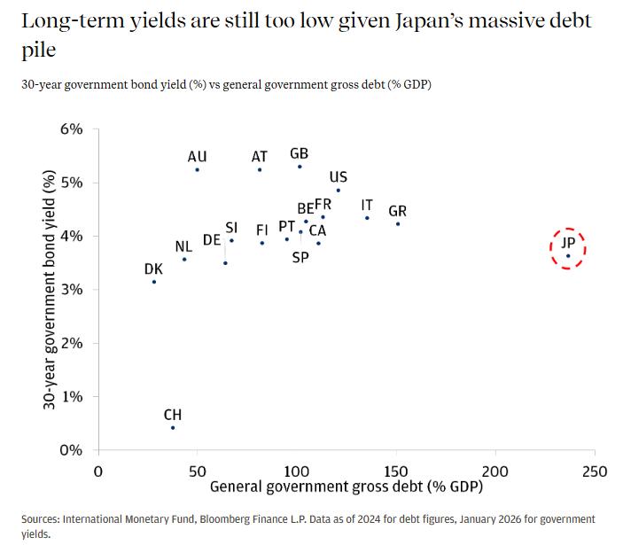市场已多次通过推高日本国债收益率和日元贬值来表达对这种激进财政扩张的不安。日本的债务占GDP比重高达230%以上,位居世界最高之列,其预算中约有四分之一用于偿债,然而,日本国债的收益率却与财政基本面更强的经济体相近。