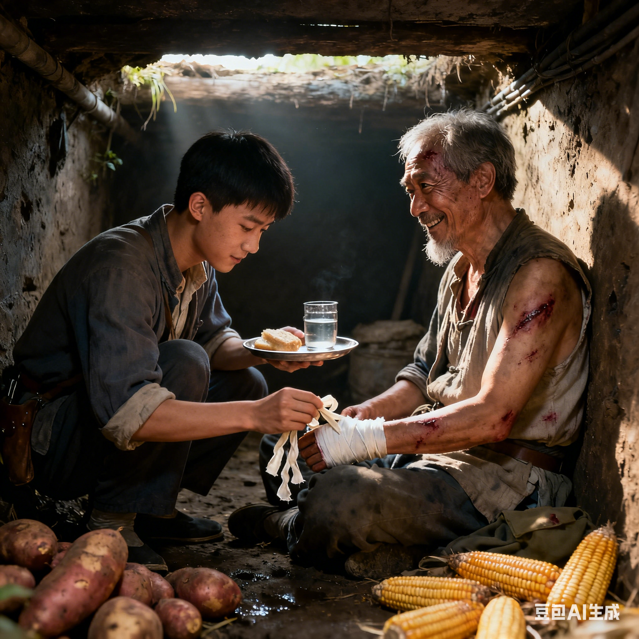 回到家,水生把老周藏进了后院的地窖里。地窖不大,里面堆着一些红薯和玉米,阴暗又潮湿,但至少安全。他给老周端来水和干粮,又找了些干净的布条,帮老周简单包扎了伤口。老周感激地看着水生:“小兄弟,谢谢你,你叫什么名字?”“水生。” 水生低着头,小声回答。“水生,好名字,” 老周笑了笑,“等这次任务完成了,我一定跟队伍里的同志好好夸夸你。”