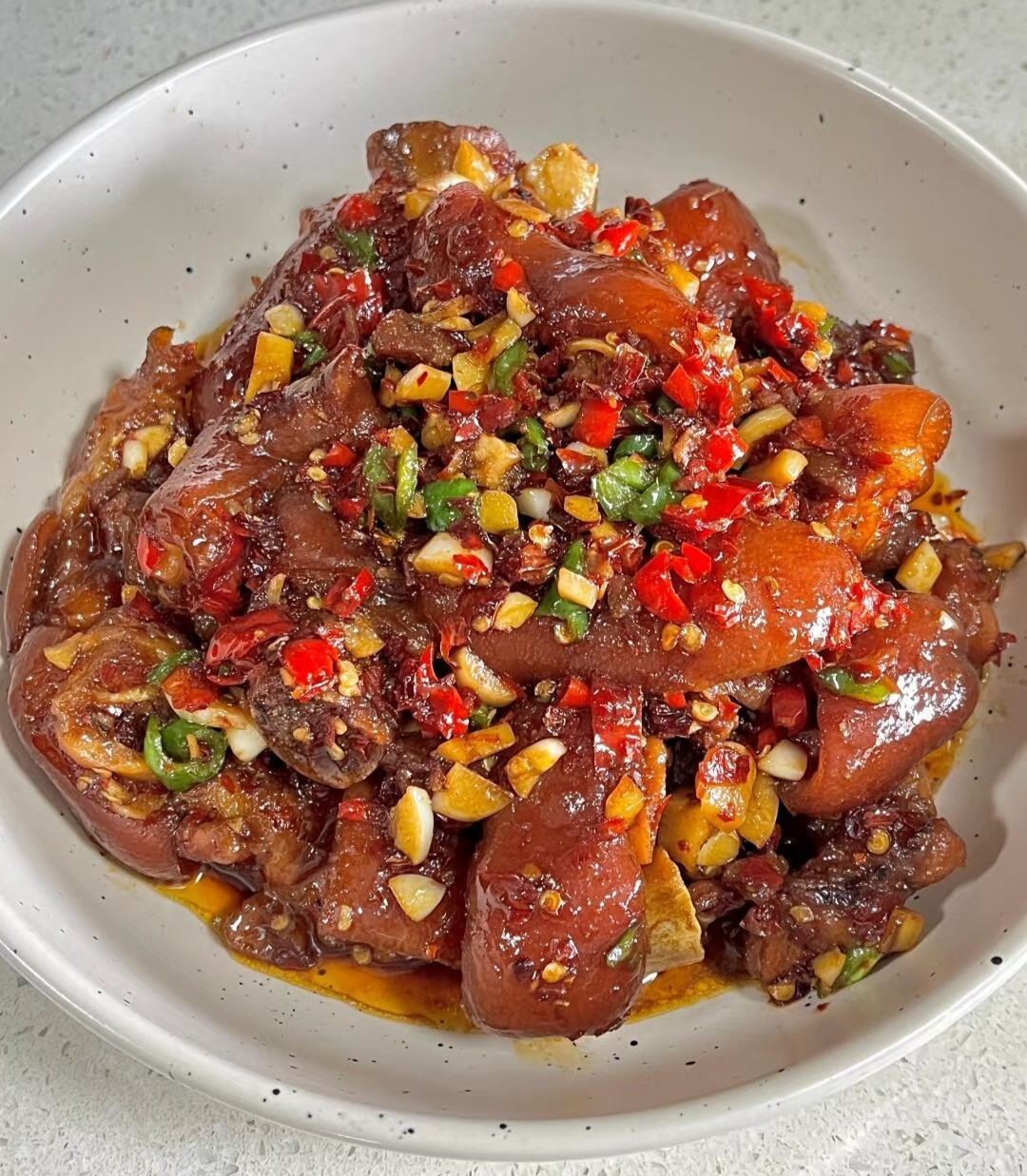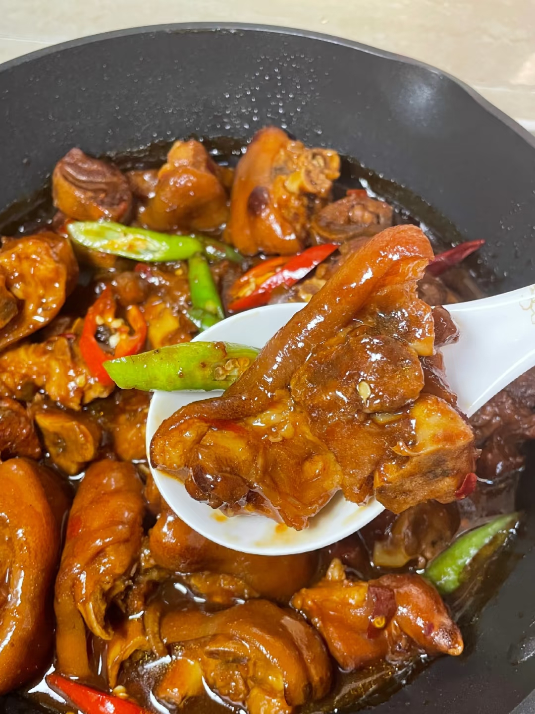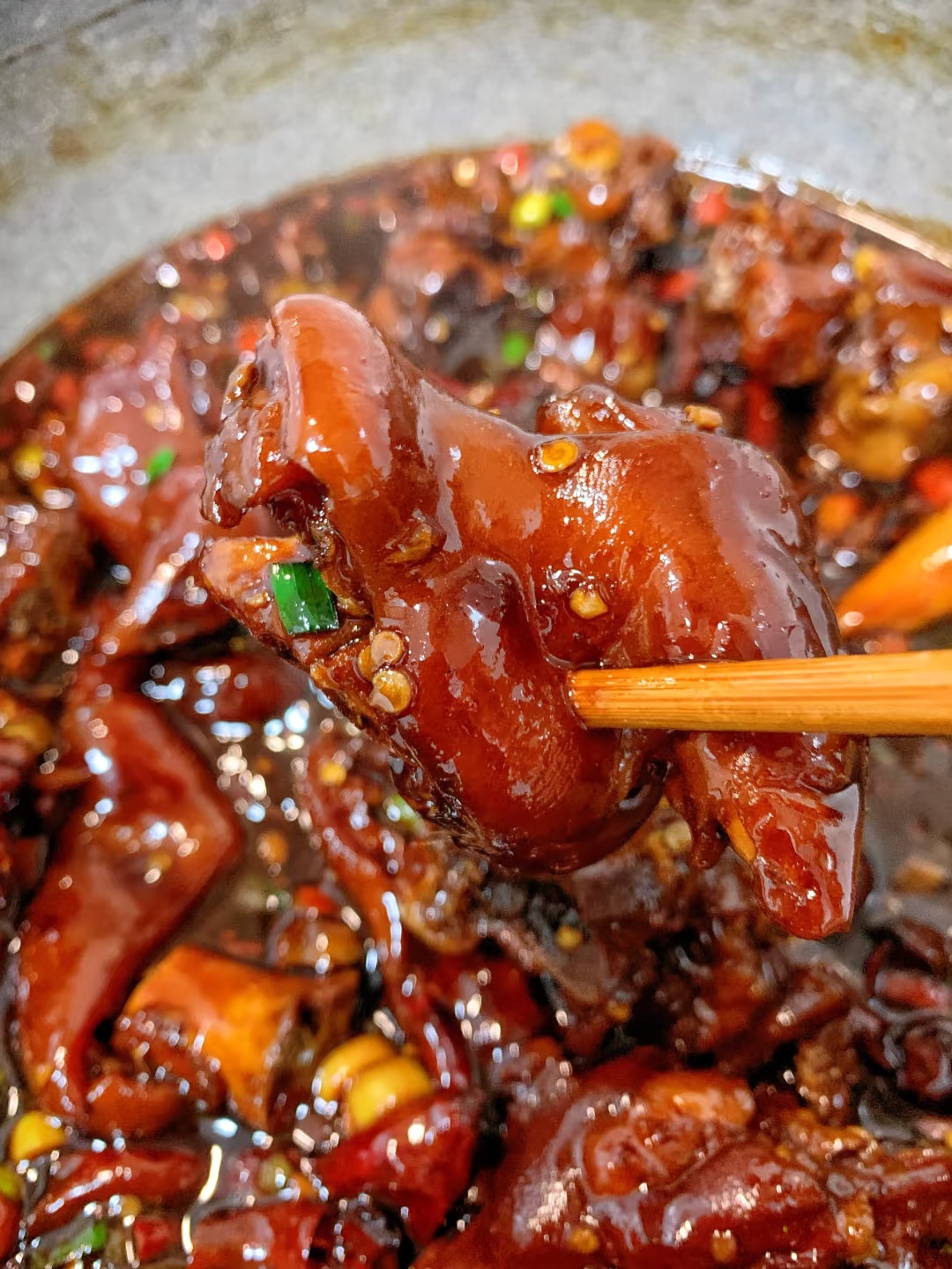 吃猪蹄简直就是我最喜欢的吃播现场,能感受胶质暴击的快乐,刚出锅的猪蹄还冒着热气,筷子一夹就duangduang晃动,咬下去先是辣味窜上来,接着是胶质在舌尖化开的绵密感,瘦肉吸饱了酱汁,肥肉入口即化。这时候,要是配一杯冰可乐解辣,或者直接拌饭——简直就是人生一大幸事,好友说的牵丝诚不我欺!