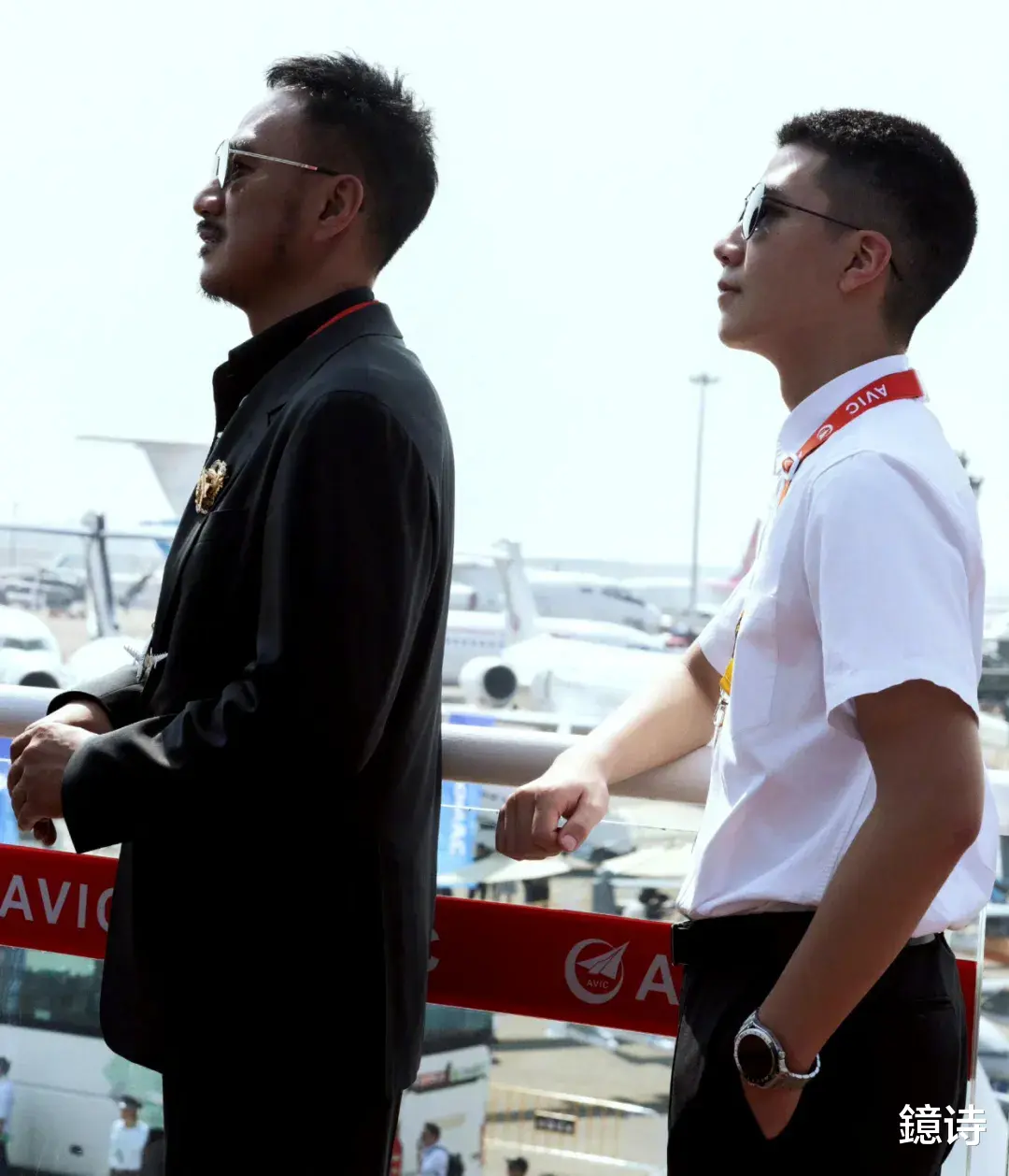 跟随胡军一起参加航展,父子俩站在一起,军人形象如出一撤,镜头面前表现出对各类机型的喜悦和喜爱之情。