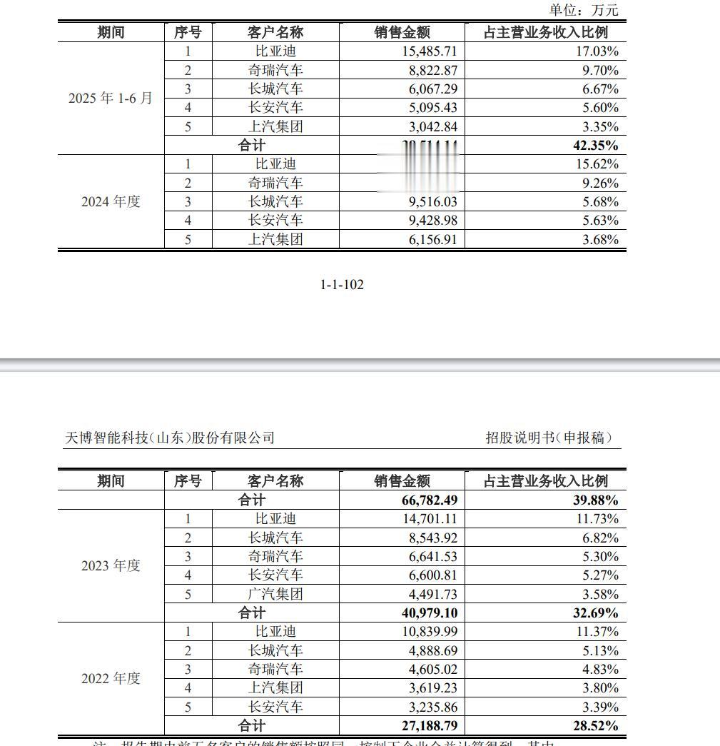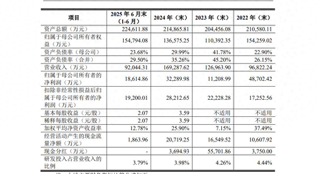 报告期内(2022年至2025年上半年),天博智能的营业收入分别为9.68亿元、12.7亿元、16.93亿元、9.2亿元;归母净利润分别为4.87亿元、1.12亿元、3.23亿元、1.86亿元。