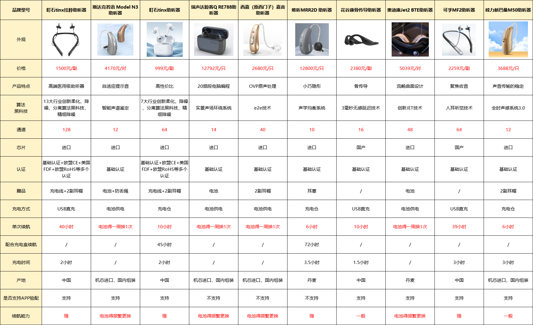 选购之前,真的得先把这些表格数据瞄一眼,不然买起来容易踩坑,我之前就吃过亏,哎…你懂的吧。反正说实话,看清参数比看广告可靠多了。下面整理的是这次参与测评的几款助听器的详细数据:
