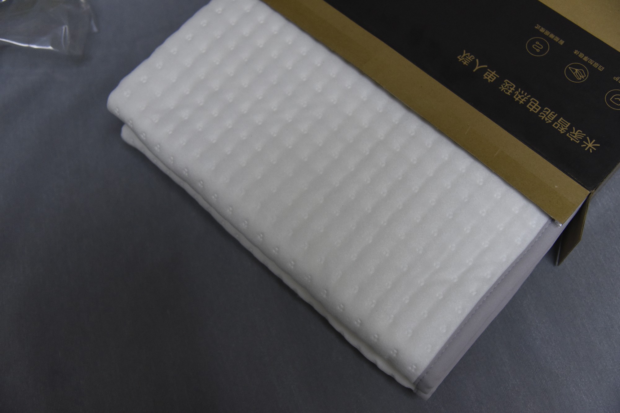 拆开包装时,就感受到了米家一贯的简约质感 —— 没有多余的花哨设计,白色主包装盒上印着产品示意图和核心卖点,打开后里面整齐摆放着电热毯主体、电源线、说明书和一个小小的收纳袋,收纳袋刚好能装下折叠后的电热毯,换季收纳超方便。