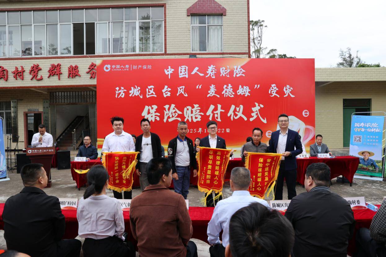 赔付仪式现场,广西壮族自治区农业农村厅、广西壮族自治区财政厅、防城港金融监管分局、防城区政协、中国人寿财险广西分公司等单位领导,共同为受灾养殖企业和养殖户代表递出理赔支票。部分受灾农户向中国人寿财险防城港市中心支公司赠送锦旗。鲜红的锦旗上印着 “风雨无情人寿有爱 快速理赔一诺千金”“雪中送炭及时雨 保险理赔暖人心”“高效理赔暖人心 尽职尽责显担当”等字样,每一面锦旗都凝聚着受灾农户的真挚谢意,这既是对中国人寿财险专业高效服务的肯定,也见证了政府、保险与农户之间 “共抗灾情、共促复产”的深厚情谊。