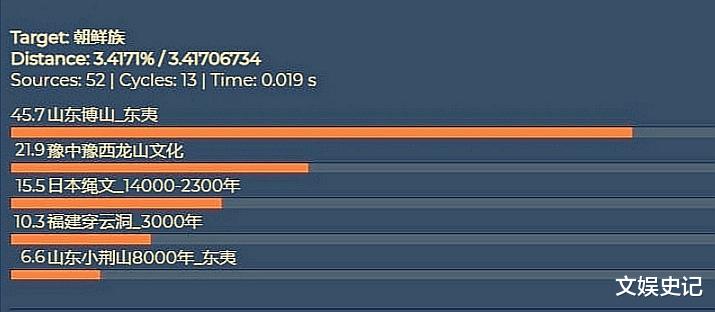 不同的结果由于测算器、样本、采集地域和数量不同,得出的结果不尽相同。但我们仍然能从中得出一些基本信息。以下面这份数据为例,现代韩国人群中检出29.5%的类锡伯成分,24.8%的类江苏成分,23.8%的类山东胶辽成分,21.9%的类浙江成分,并没有检出“湖北楚人”的成分。