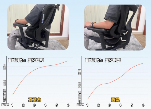 从酸痛感变化曲线来看,夏草木这款整体的酸痛感变化很平滑,不会出现变化剧烈的情况,哪怕到了5-6小时的久坐时间,酸痛感也不算很明显,这是由于椅子搭载的ZeroG2.0灵动腰靠系统,可以精准贴合腰椎自然曲线,随坐姿变化实时调整支撑角度与力度,做到全程稳定守护。