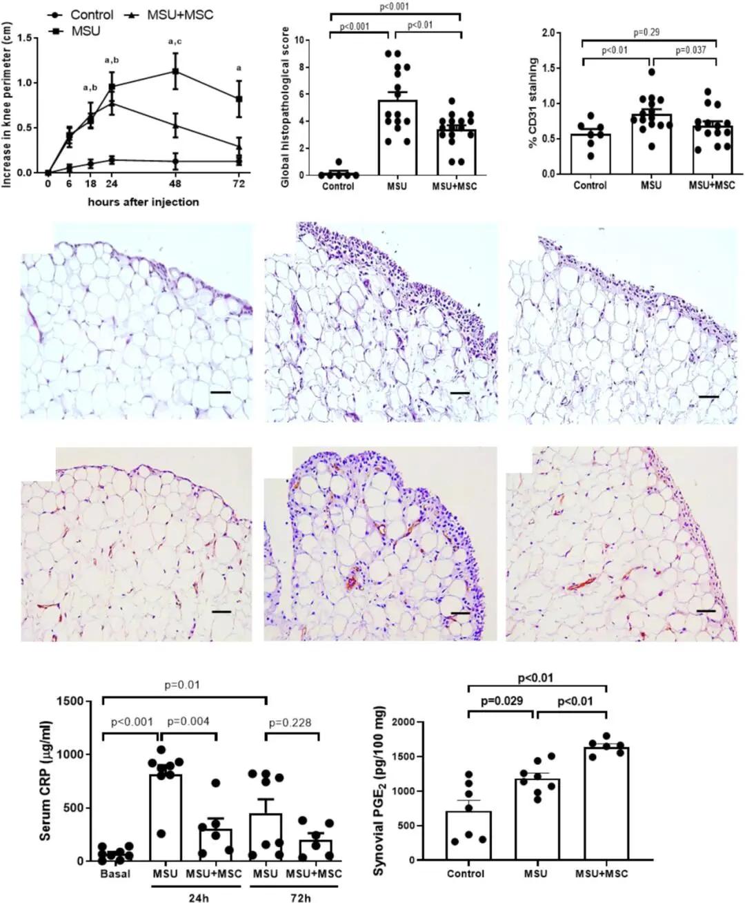 该项研究的数据表明,MSC的全身给药可改善关节内注射MSU(尿酸钠)诱发的急性痛风模型中的关节炎症。MSC显著减少了膝关节炎症高峰期的关节肿胀。72小时后,接受治疗的动物的炎症完全消退,而未经治疗的动物仍然存在明显的关节炎症。