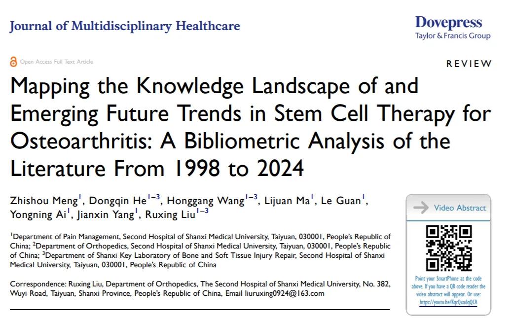 2025年3月4日,山西医科大学第二医院的团队在行业期刊Dovepress上发表了一项文献计量研究,通过分析全球26年、2341篇相关论文揭示了骨关节炎治疗领域的发展脉络和未来趋势:干细胞临床治疗骨关节炎的研究正在迎来爆发期,中国和美国领跑赛道,外泌体或成为下一代“黑科技”。