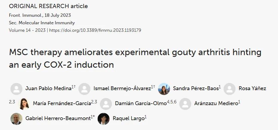 [2] Medina, Juan Pablo et al. “MSC therapy ameliorates experimental gouty arthritis hint‐ing an early COX-2 induction.” Frontiers in immunology vol. 14 1193179. 18 Jul. 2023.