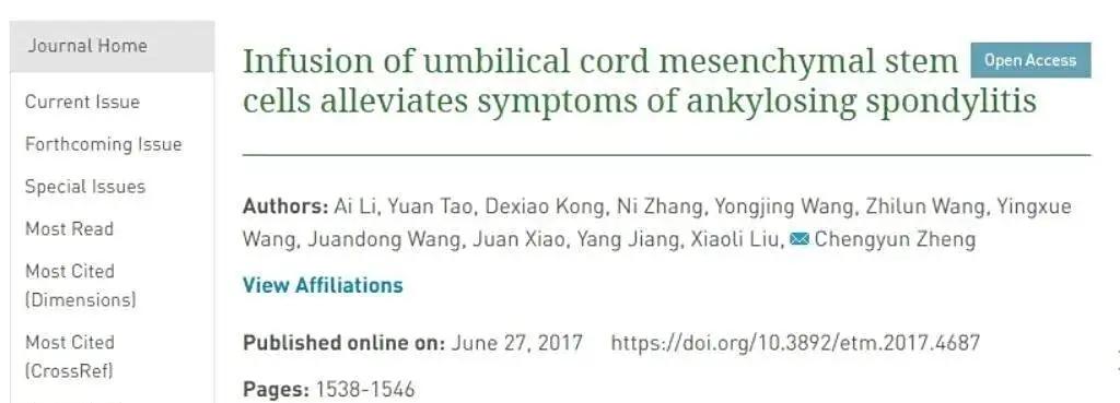 2017年6月27日,山东大学第二医院血液科研究团队 在国际学术期刊上发表了一篇“Infusion of umbilical cord mesenchymal stem Accesscells alleviates symptoms of ankylosing spondylitis”的研究成果。
