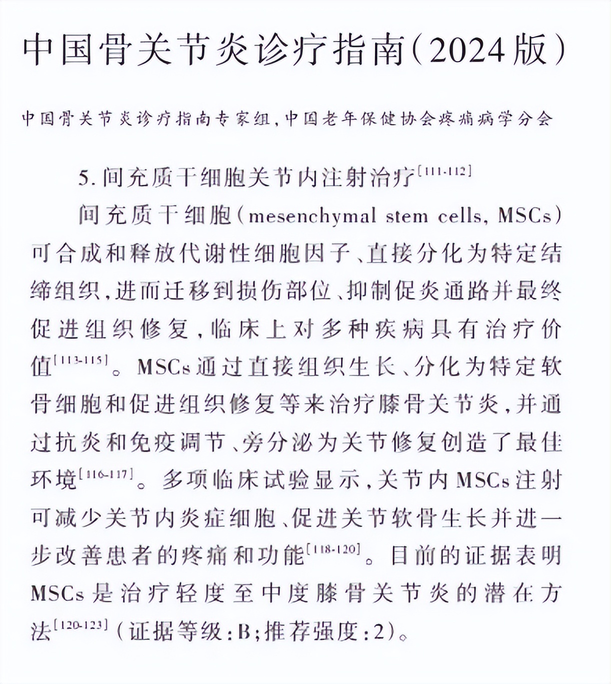 近几年,国内外多项临床试验数据证明,使用干细胞治疗OA是一种具有较好疗效且安全可靠的治疗方式。在《中国骨关节炎诊疗指南(2024 版)》指南中,间充质干细胞关节腔输注被推荐用于干预骨关节炎。
