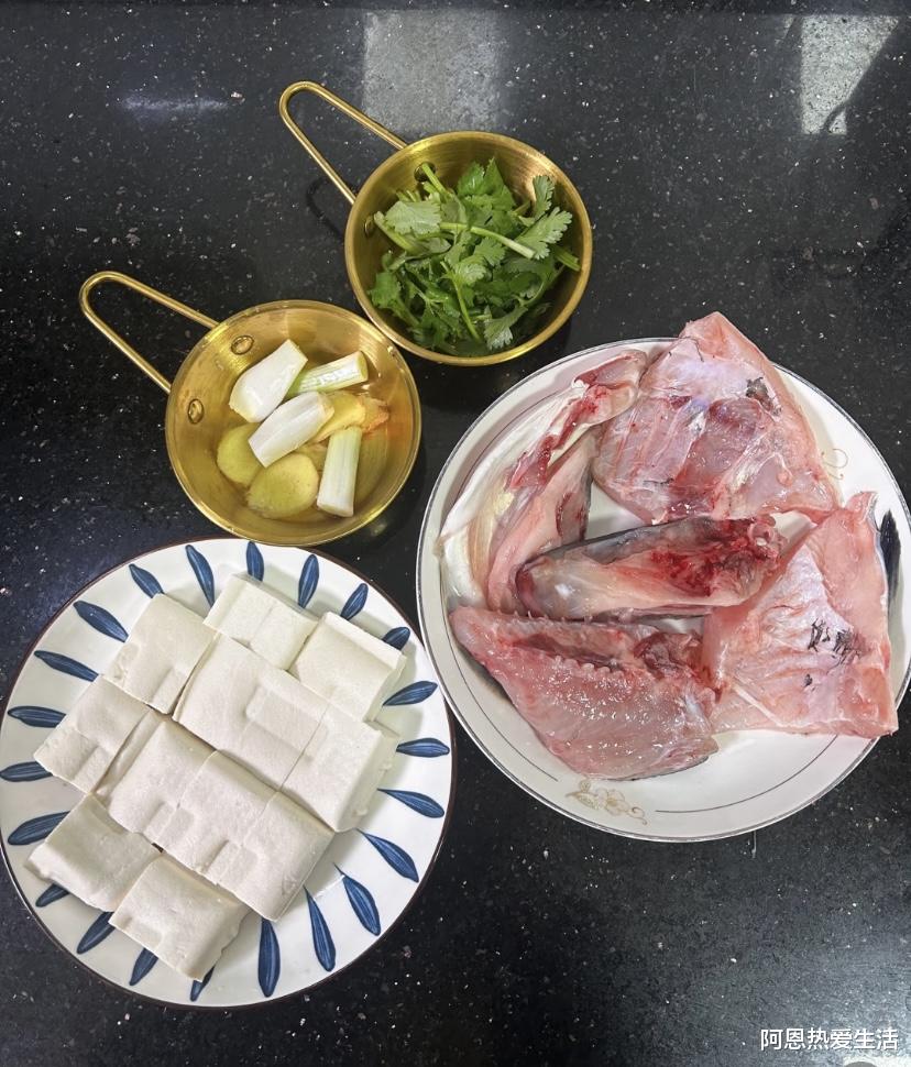 准备食材:新鲜鱼头1个(约500克,草鱼、鲢鱼头都可以),嫩豆腐1块(约300克),姜片5-6片,葱2根,料酒1汤匙,盐适量,白胡椒粉少许,食用油适量,开水一壶(这是汤色奶白的关键!)