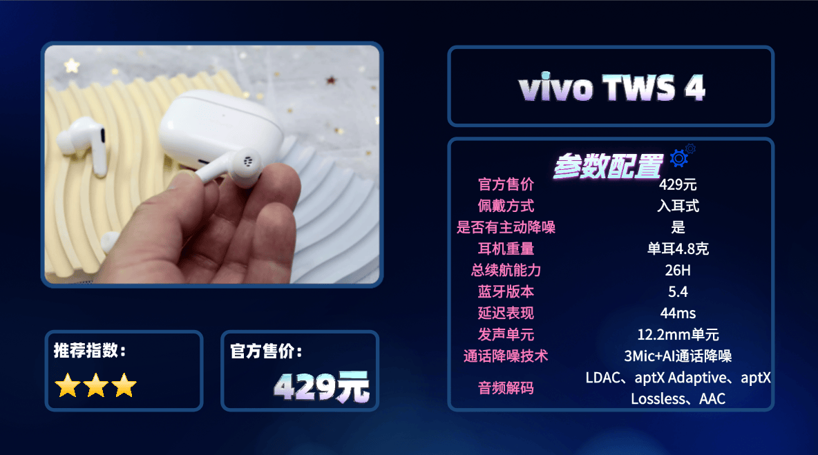 续航与连接表现也算稳健。单耳可连续使用约10.5小时,配合充电盒总续航可达44小时,日常通勤或外出使用都不必频繁充电。蓝牙连接稳定,延迟控制良好,日常看视频、玩游戏都能保持较为同步的体验。总体来看,vivo TWS 4是一款兼顾音质和日常使用体验的耳机,适合追求清晰通透听感和便捷操作的用户。
