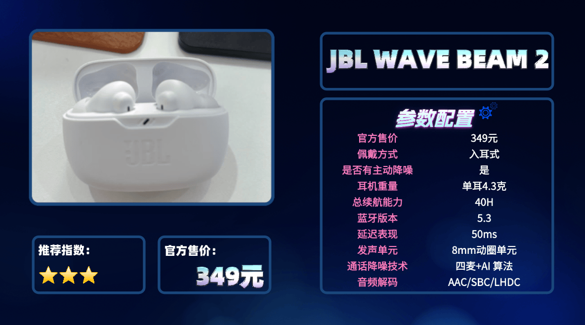 音质表现上,WAVE BEAM 2搭载8mm动圈单元,整体调音偏清透,中高频表现稳定,人声清晰,低频厚度适中但下潜略浅,高频略微保守不刺耳,日常听流行、轻电子或有声内容比较舒适。得益于哈曼调音,整体听感平顺自然,但对追求极致低频或超宽声场的用户来说可能稍显一般。在连接与续航上,支持蓝牙5.3协议,连接稳定性良好,音画延迟控制也比较理想。单次续航约10小时,配合充电盒总续航可达40小时,应对日常通勤或上班使用绰绰有余。