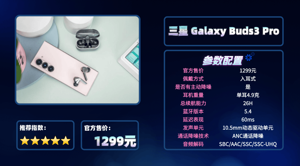 三星Galaxy Buds3 Pro这次放弃了经典的“豆子”造型,改用更主流的柄式设计,外观上加入了透明材质和灯带点缀,科技感和辨识度都很高。单只重量约5.4g,虽然不是最轻的,但佩戴时贴合度不错,走路、运动时都不容易松动。