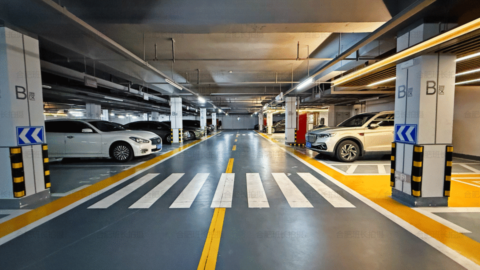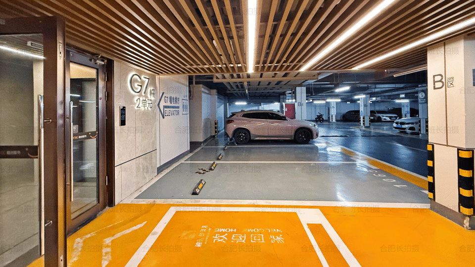 再来看看地下空间的表现,负一楼单元厅门口有明亮的灯带,地面为环氧地坪,各区也用不同色彩进行了分区,视觉效果不错。