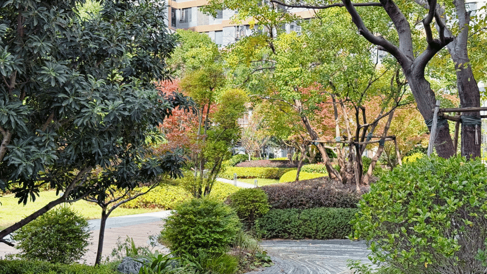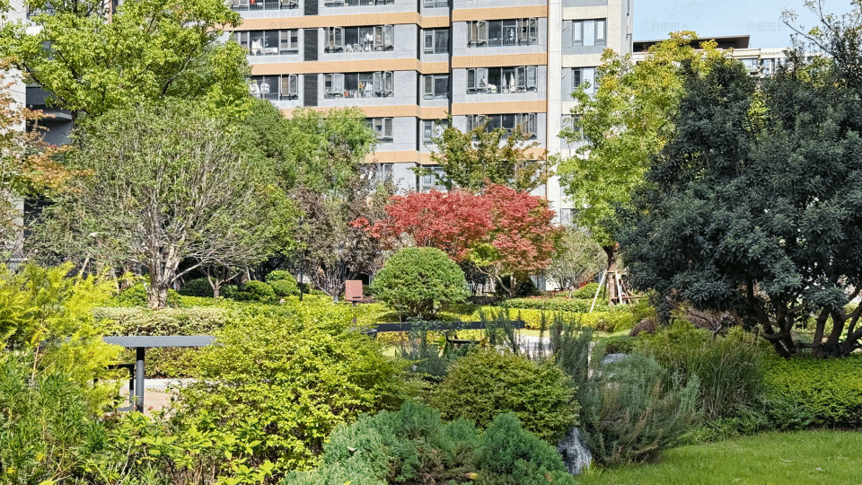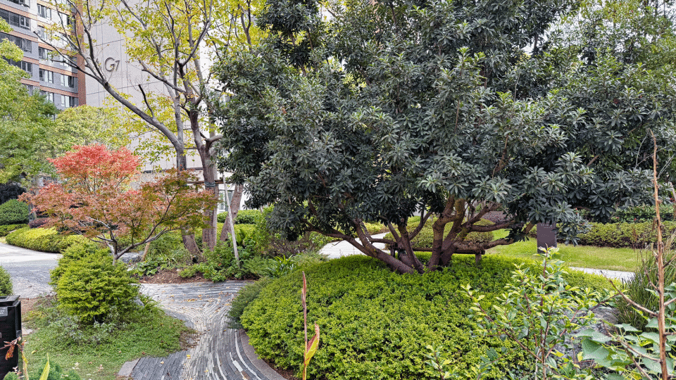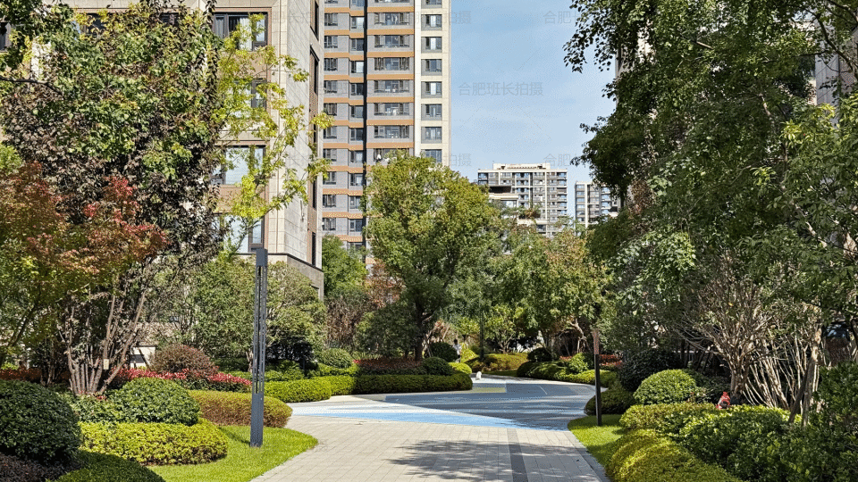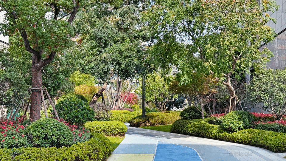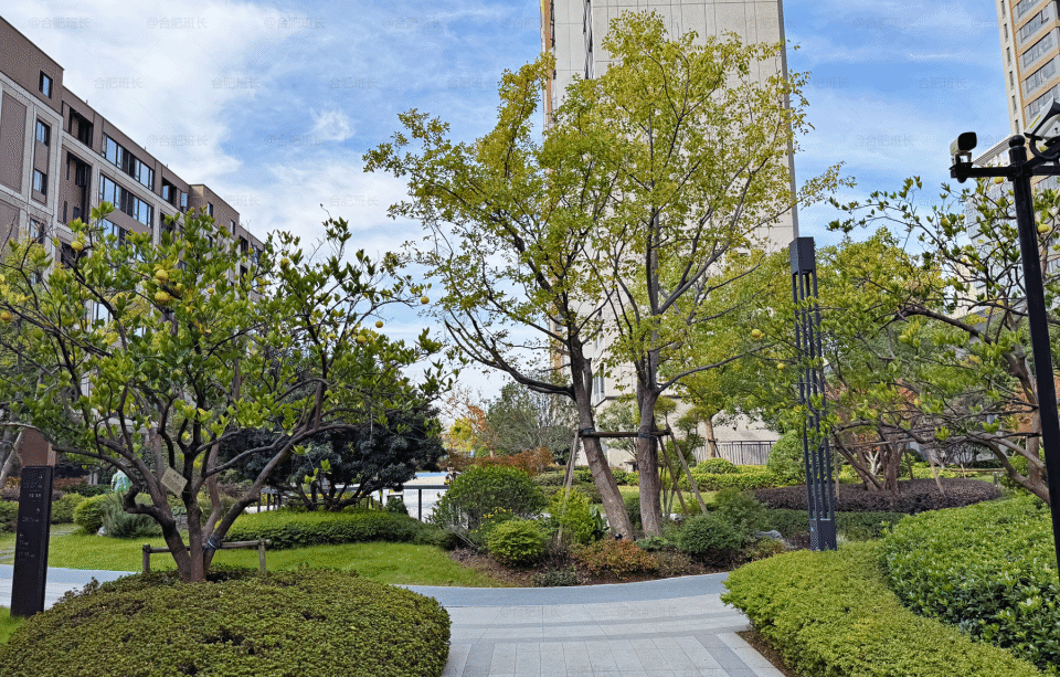 除中心广场外,其他位置绿化同样可圈可点,高大的乔木和灌木组成了一个个景观组团,斜飘类、丛生类树木也随处可见,融创开发的小区喜欢种植大量果木,春夏有花、秋冬赏果,赏心悦目。