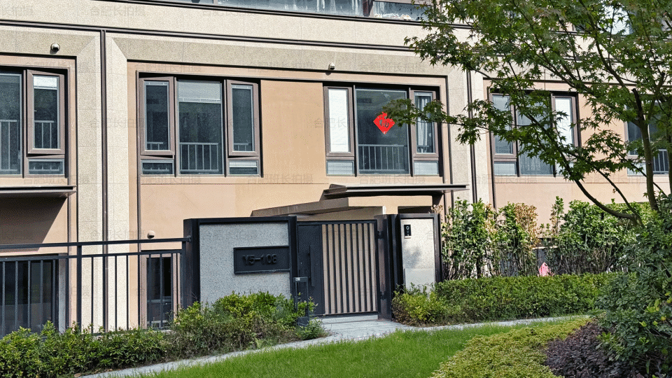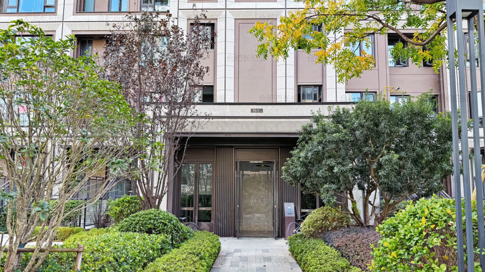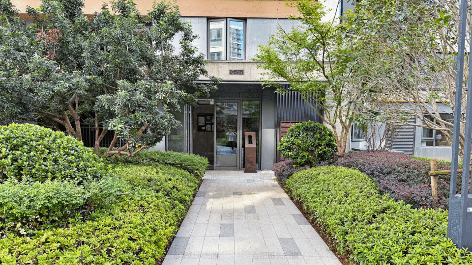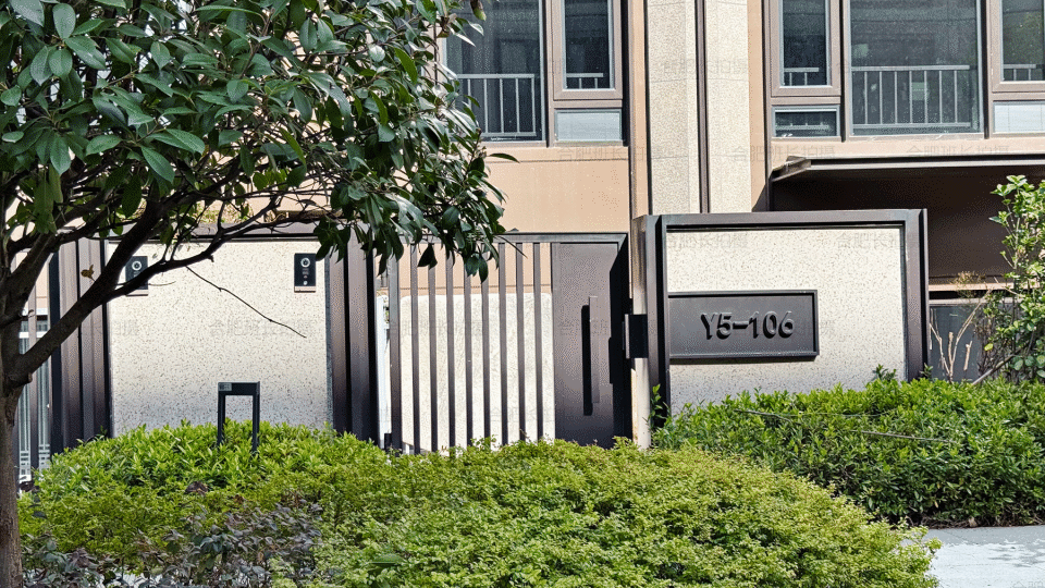 洋房单元厅保持与小区大门风格统一,同样是浅灰色石材+咖色铝合金,种植有层次感非常强的宅前绿化,丛生金桂、丛生红叶李和丛生杨梅树搭配高矮不同的灌木,归家仪式感非常强。