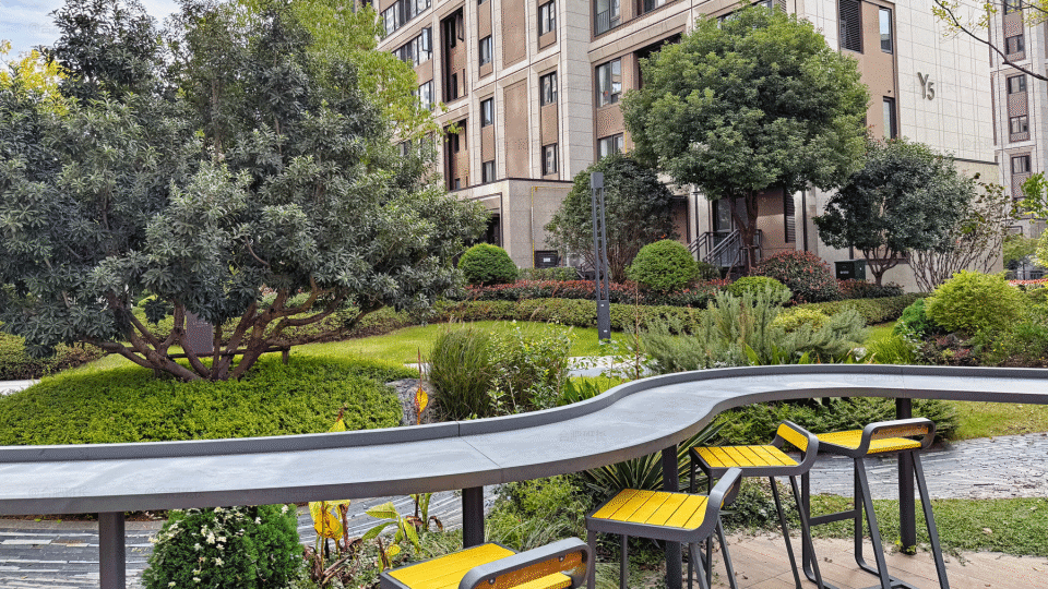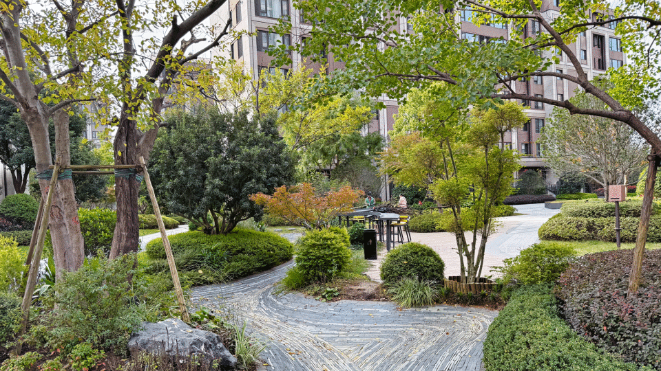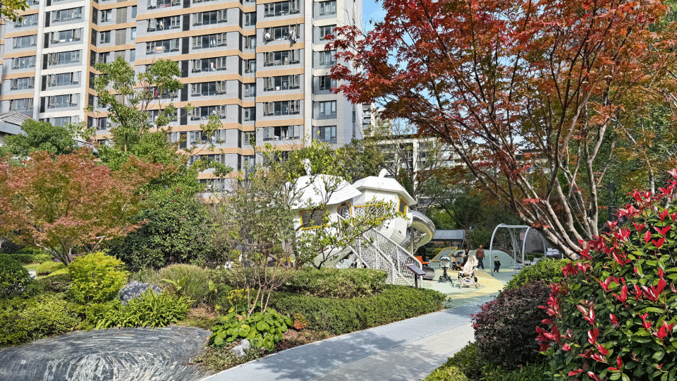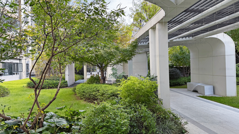 高层区的楼间距非常大,低楼层也能享受比较好的光照,绿植种类很丰富,如香泡、杨梅、香樟、红枫、乌桕、榉树等,闲暇时光坐在这里发发呆、赏赏景应该还是非常惬意的。