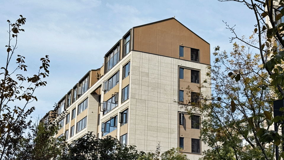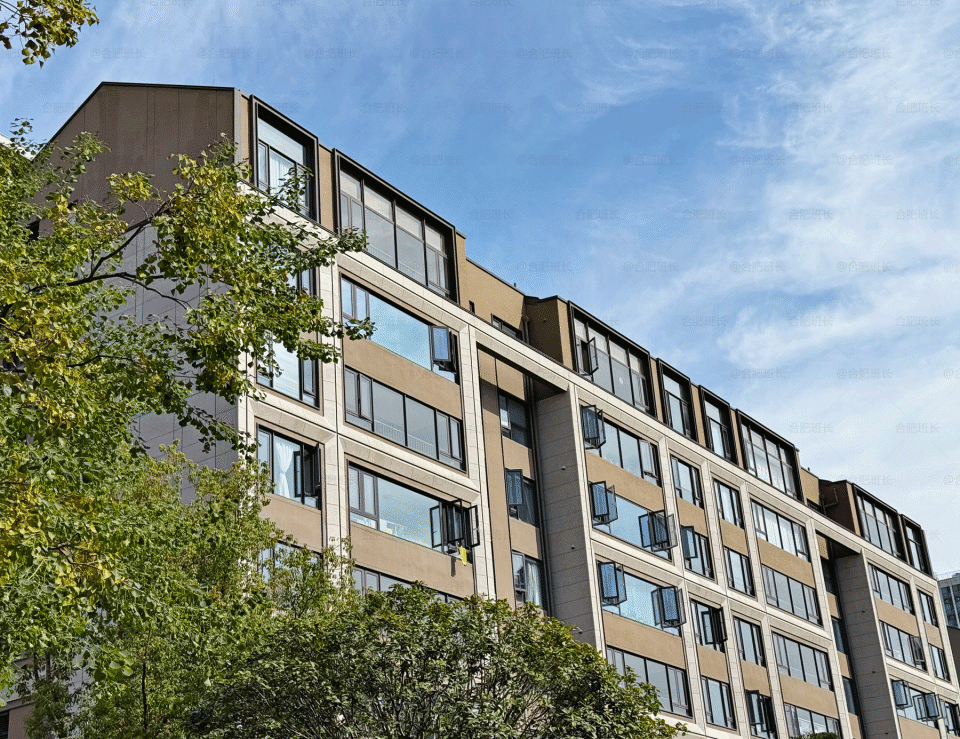高层外立面基座用石材装饰,楼栋主体用了圆角铝板进行点缀,楼顶银色铝板+香槟金色穿孔铝板组成的“V字形”塔冠非常有识别度,在上海路上很远就能看到,和洋房的斜坡顶一起与周边建筑形成了明显差异化。