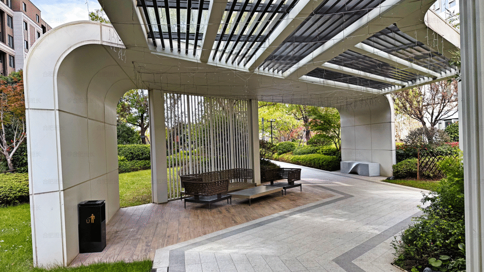 进入小区后首先看到的是米白色的风雨连廊,“回家即归心”也表明这是融创物业管理的楼盘。连廊运用了大量曲线设计,左右两侧则是各类景观绿化,比较有特色的是连廊和观景廊亭进行了统一设计,整体性比较强。