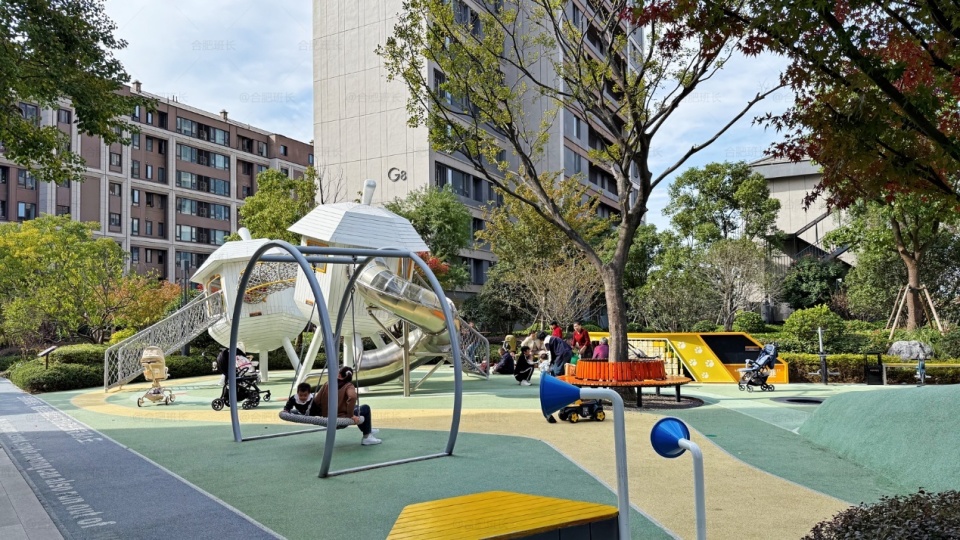 儿童游乐场面积不小,地面为彩色软性材质,松果造型的白色滑梯与小区整体风格匹配,还有圆形秋千、传声筒等多种游乐设施,从图中可以看出非常受小朋友欢迎,人气旺盛。