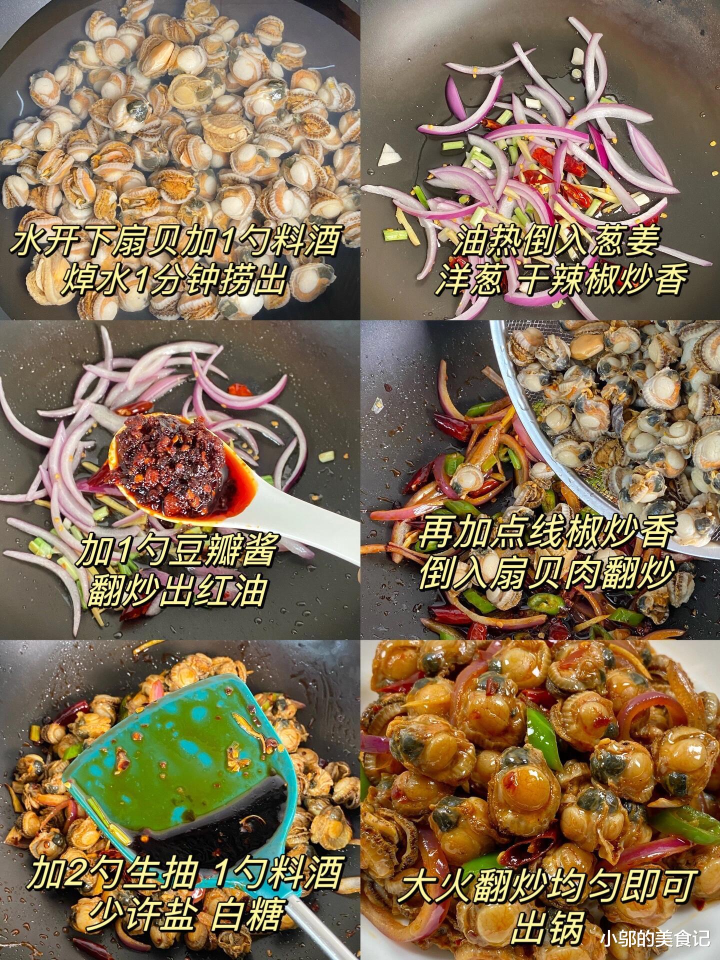 烹饪的过程讲究“快”与“准”。首先,扇贝肉需要快速焯水。水开后加入一勺料酒,放入扇贝肉焯烫约1分钟,看到扇贝肉微微卷曲即可捞出沥干。这一步不仅能去除腥味,还能让扇贝肉在后续爆炒时更容易入味,同时保持其嫩滑的口感。热锅凉油,油温七成热时,下入葱姜蒜末、洋葱丝和干辣椒段,用大火快速煸炒出香味。当香味弥漫开来时,加入一勺豆瓣酱,继续翻炒,直到炒出红油,这是让整道菜色泽红亮、味道浓郁的关键。