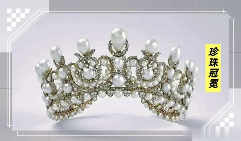 6.珍珠冠冕由莱蒙尼耶于1855年制作,其设计承袭路易十六时期新古典主义风格,镀金银丝底座密镶1998颗钻石,冠身缀212颗珍珠,珠光钻彩交相辉映。