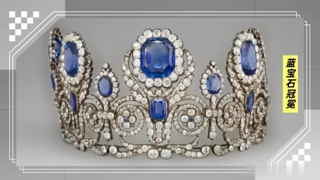 1.蓝宝石冠冕是整套首饰的核心,冠冕以金银为底,共镶嵌24颗斯里兰卡蓝宝石,1083颗钻石,以花卉、月桂叶为古典造型,呈现出浪漫主义自然风格。