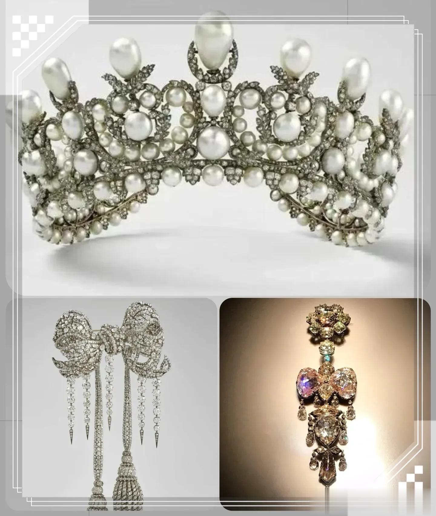 它采用了经典的“希腊回纹”头冠造型,通体镶嵌了多达1200颗钻石,并点缀着罕见的粉红色和绿色的宝石。它不仅是无价之宝,更是第二帝国艺术与工艺的巅峰代表。