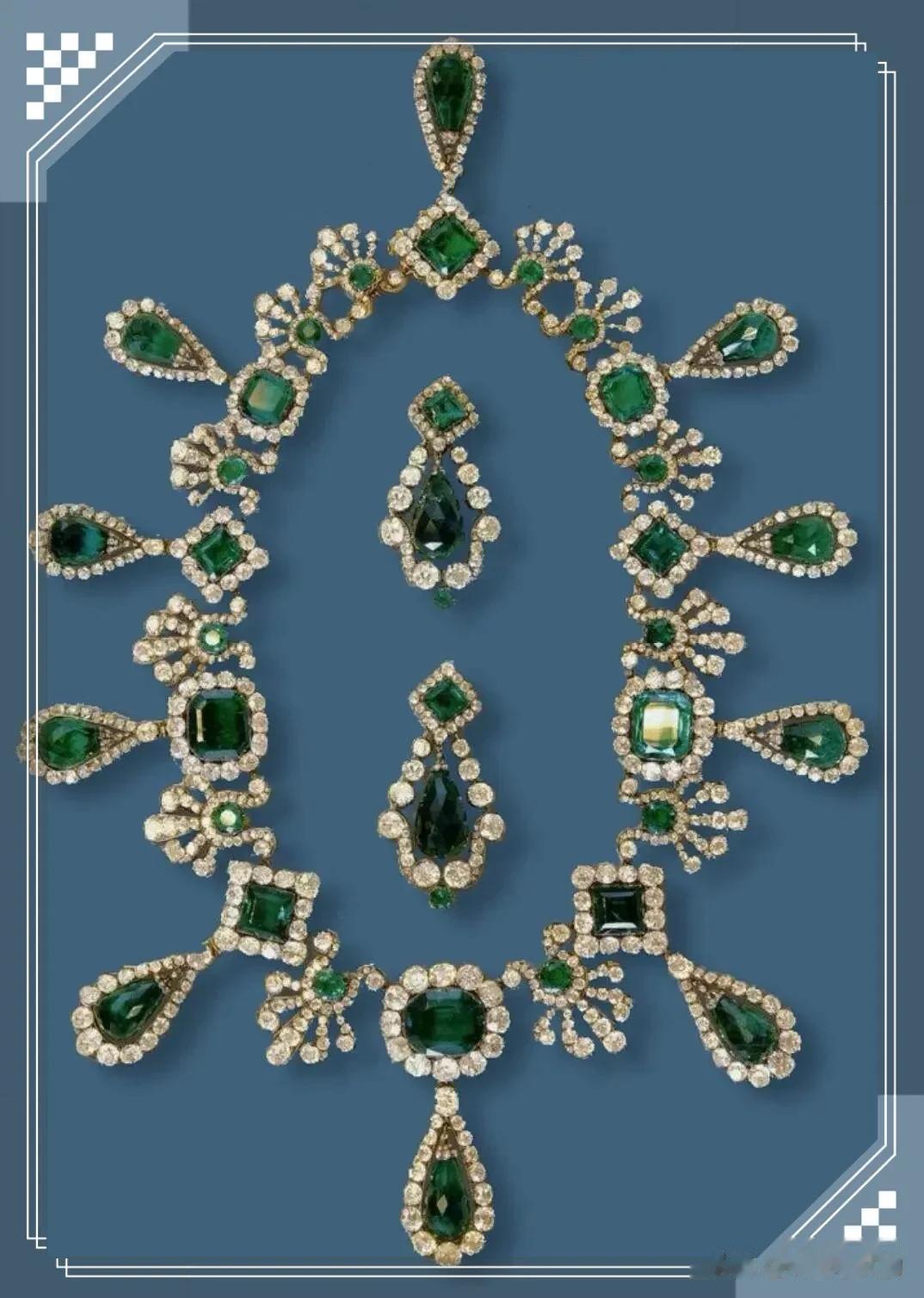 这套已丢失的祖母绿项链与耳坠是拿破仑一世二婚时,迎娶奥地利公主玛丽·路易丝时赠予的结婚礼物。套装由32颗祖母绿与1138颗钻石构成,以精巧的菱形与珍珠造型排布,于2004年正式入藏卢浮宫。
