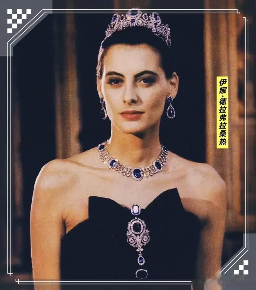 2.蓝宝石项链的设计与蓝宝石冠冕相得益彰。其为蓝宝石和钻石交替镶嵌的华丽颈链,由8个颗蓝宝石和631颗钻石组成,另有1个大型吊坠和两枚蓝宝石扣与之相配。其长度和重量都彰显了皇家气派,佩戴时能完美衬托出礼服的低领设计。