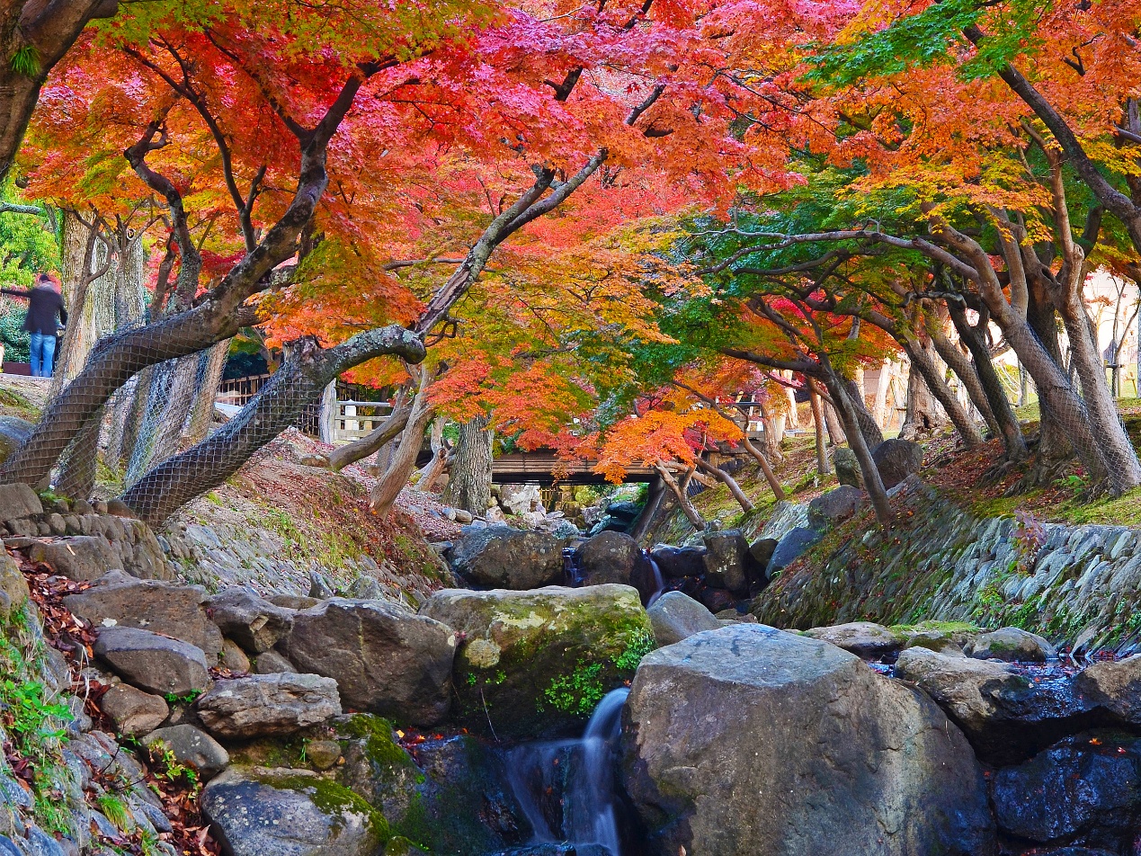 箕面公园是一条沿溪徒步的赏枫路线,步道两旁的红叶与阳光交织,形成了一个迷人的秋景隧道。尤其是阳光透过树叶洒下来时,整个公园的枫叶看起来如同被点亮一般。