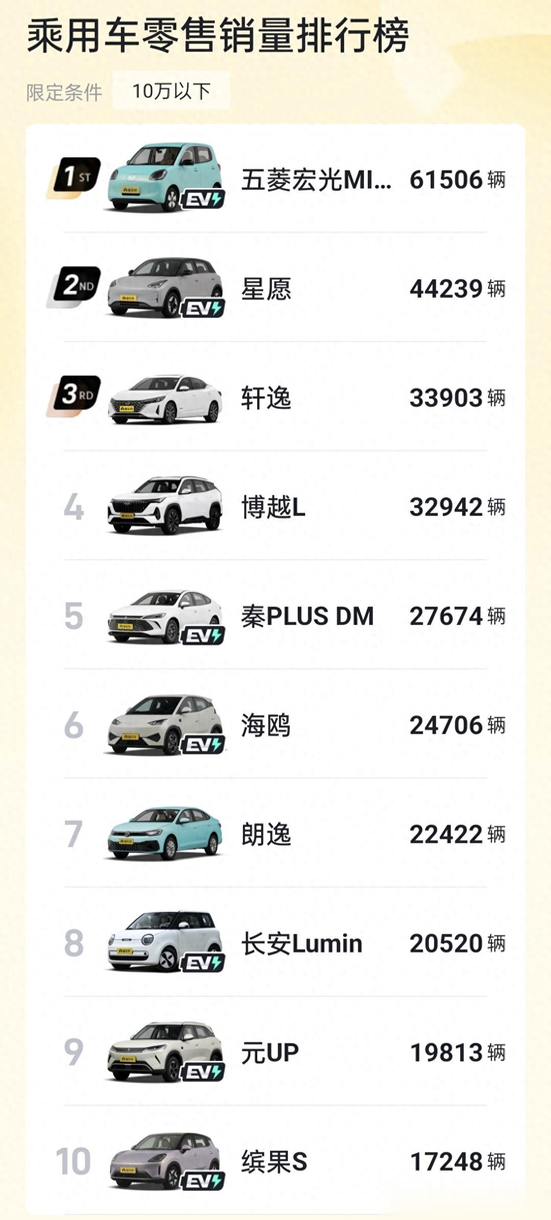 10万元以下市场已经全面电动化,新能源小车正在成为城市年轻人首选的“代步神器”。五菱宏光MINI EV依旧稳居王座,星愿、海鸥、长安Lumin等新秀不断发力,展现出中国品牌在小型新能源车领域的绝对统治力。而轩逸与朗逸等燃油老将仍凭口碑守住阵地,为传统汽车市场留下最后的荣光。