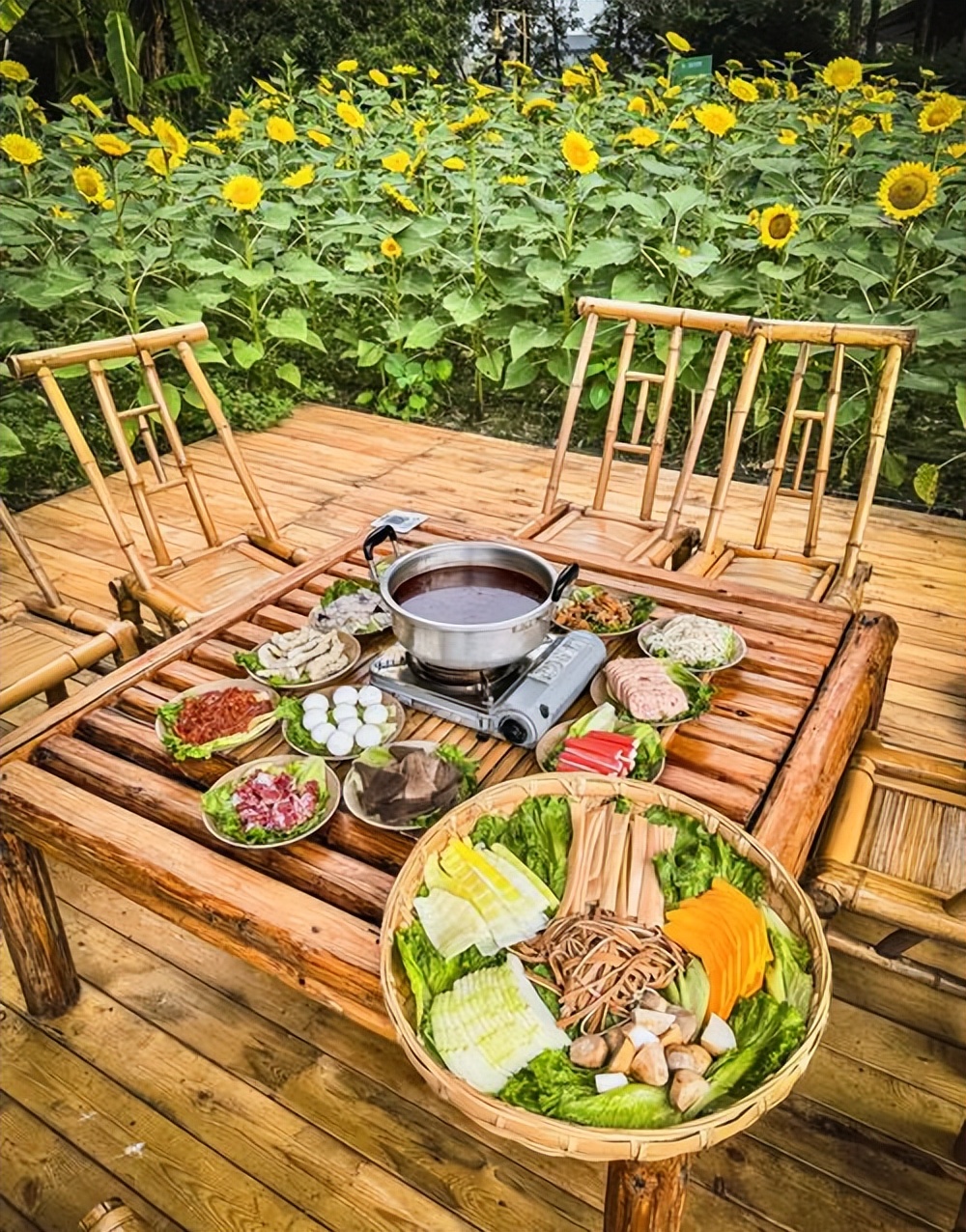 从场景营造来看,它打破了传统火锅的室内局限,将餐桌搬到自然中。新津安西镇月花村的花田火锅,由“村集体+乡村合伙人”共同打造,在花田旁修建观景台,露天桌椅错落摆放,风吹花动时,花香与火锅热气交织,抬头是花海,低头是沸腾的锅底,这种沉浸式体验是城市火锅店无法复制的。