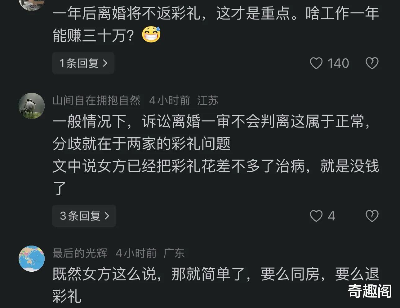 因为一旦离婚,她不仅要面临退彩礼的风险,甚至还可能涉及到骗婚嫌疑;只要不离,拖过法定期限,这三十多万就不用再还了。目前,当地相关部门已经介入调解。女方家属这时却说要“考虑离婚” 。只不过已经过了一年,男方彩礼能拿回来多少,现在也无从知晓。对此,大家有什么看法吗?
