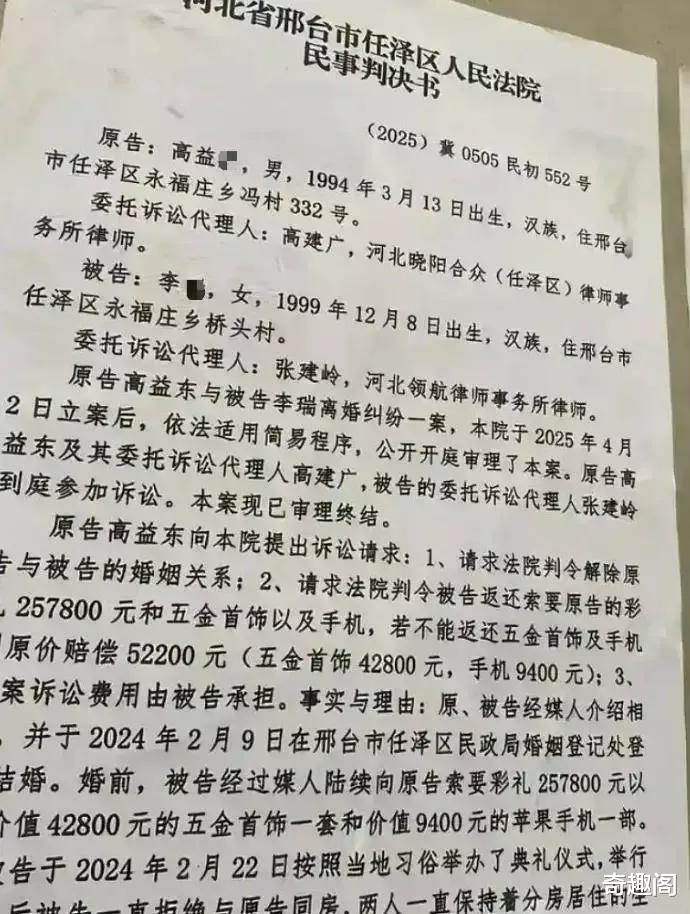 邢台骗婚案后续:律师曝内幕,女方拒绝同房、也不离婚!拖过一年就不用退彩礼了