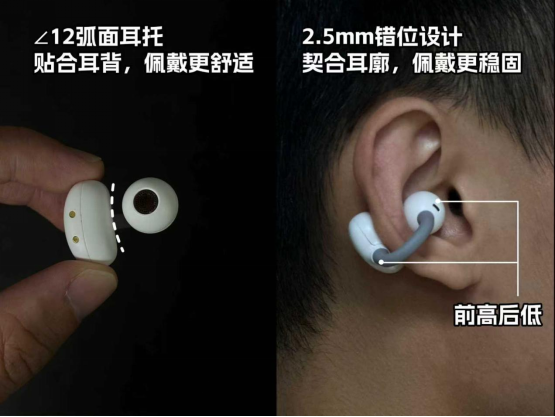 在佩戴上延续了品牌的轻量化优势,单耳仅 4.5g的重量,上耳后几乎感受不到负重感,即便是长时间佩戴办公、通勤,耳朵也不会出现明显的酸胀与压迫感。经典的2.5mm 错位设计搭配 12° 弧面耳托,前者前高后低的形态让耳机能贴合耳部自然轮廓戴着更稳定,后者则为耳部提供了合理的支撑形成稳定的支撑结构,日常走路、上下楼等活动中,耳机能牢牢贴合耳骨,不会出现松垮滑落的情况,佩戴的稳定性和舒适度兼顾得十分到位。