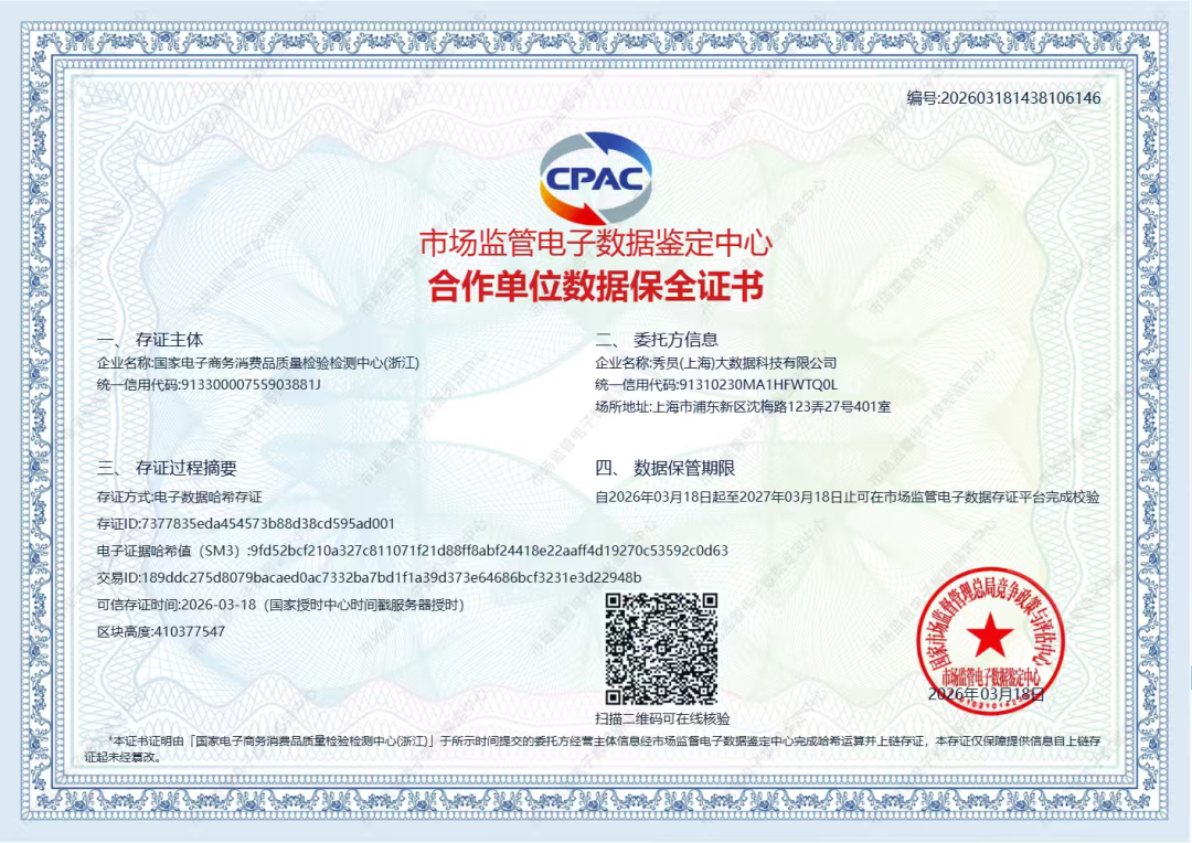 近日,秀员(上海)大数据科技有限公司(以下简称“秀员科技”)正式荣获国家市场监督管理总局竞争政策与评估中心市场监管电子数据鉴定中心合作单位数据保全证书。