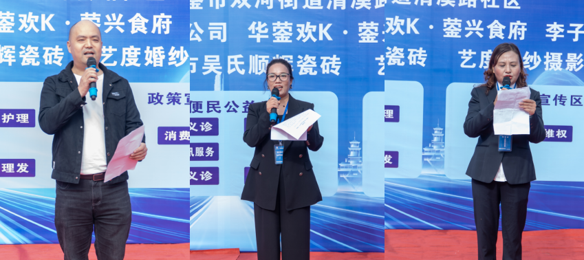 活动启动仪式现场气氛热烈,清溪路社区书记魏伟发言,他强调了此次活动对于社区发展的重要意义,表达了对活动成功举办的美好期许。协会秘书长贺春莲代表协会致欢迎辞,对参与活动的各方表示热烈欢迎,并简要介绍了活动的背景和目标。常务副会长蒋玉华则代表商户作出郑重服务承诺,表示将以优质的产品和服务回馈社区居民。