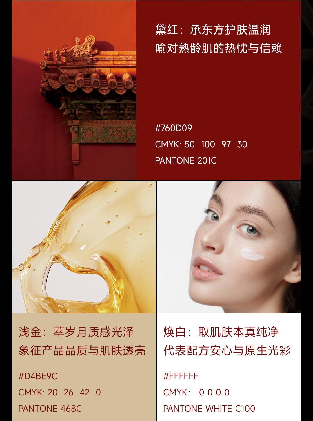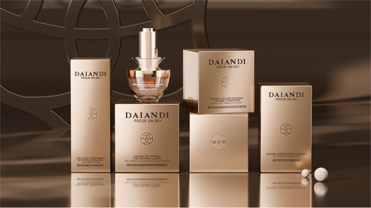 黛红取东方胭脂的温润质感,区别于刺眼的高饱和色,既传递品牌对用户的热忱,又契合50+群体优雅不张扬的审美偏好;焕白以珍珠白为基底,融入细微量的光泽粒子,代表配方安心与原生光彩;浅金借鉴和田玉的温润色调,既象征肌肤透亮的产品功效和产品的品质保障,又隐喻岁月沉淀的价值光泽。