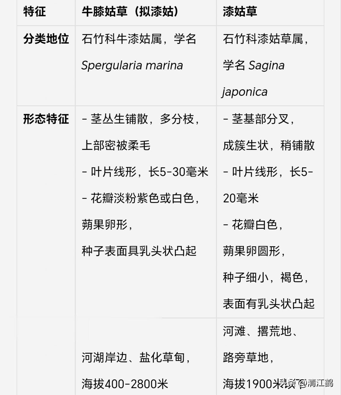 而且从植物形态和外观上看,拟漆姑的茎丛生铺散,多分枝,上部密被柔毛,叶片线形,整体形态类似牛尾或牛毛,比“漆姑草”的相似“株型”更“宠大”,因此赋予“牛”字,形成“牛膝姑”的俗称,从“形态上”说明“拟漆姑”(牛漆姑)比“漆姑草”株型更“壮观”更“宠大”更“健壮”。