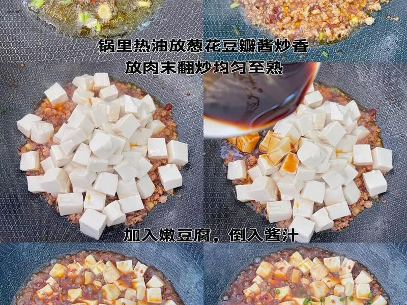 肉的部分随意又讲究:冰箱里剩的五花肉最香,三分肥七分瘦,剁碎后自带油脂电台;如果想瘦一点,就用里脊,但记得额外挖一勺猪油,香味不能省。肉末不用太多,二两足够,先加半勺料酒、半勺生抽、一点白胡椒、半勺淀粉,再淋几滴香油,顺时针搅到发黏,静置10分钟,让调料钻进肉纤维里开小会。趁腌肉空档,把配料切成“快乐小颗粒”:小米辣圈负责火辣,蒜末负责灵魂,葱花负责颜值,再准备一碗“神仙酱汁”——两勺生抽、半勺老抽、一勺蚝油、半勺糖、半勺淀粉、五勺清水,搅匀到糖融化,备用。别偷懒,提前调好等会儿才不会手忙脚乱,豆腐可不会等你翻菜谱。