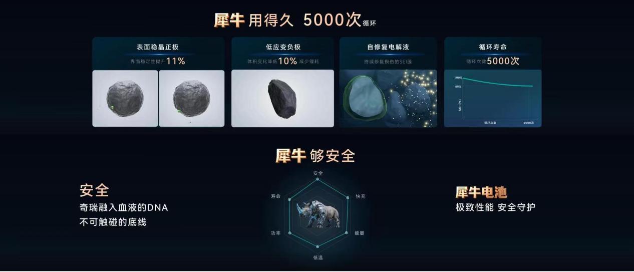 本次活动的核心主角,正是奇瑞全新打造的犀牛电池系列,该系列并非单一产品,而是针对不同使用场景,推出犀牛H(混动专用)、犀牛E(纯电专用)、犀牛S(固态专用) 三大产品线,全面覆盖混动、纯电、下一代固态电池车型的多元化需求。