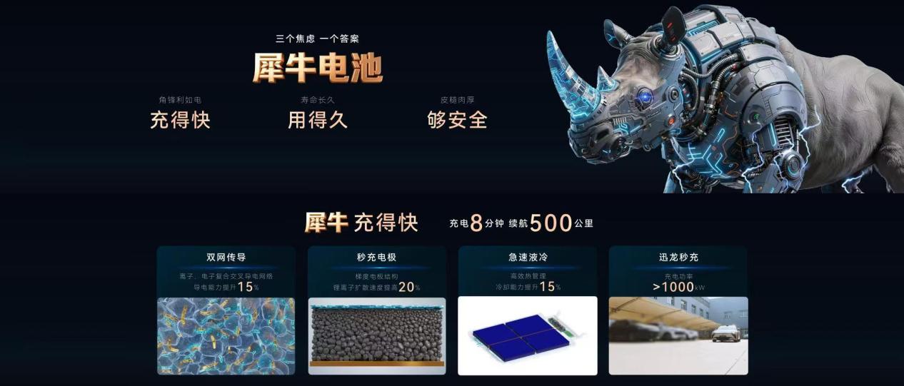 在液态电池技术上,犀牛电池直击用户充电慢、寿命短、安全焦虑三大痛点,实现全面突破:
